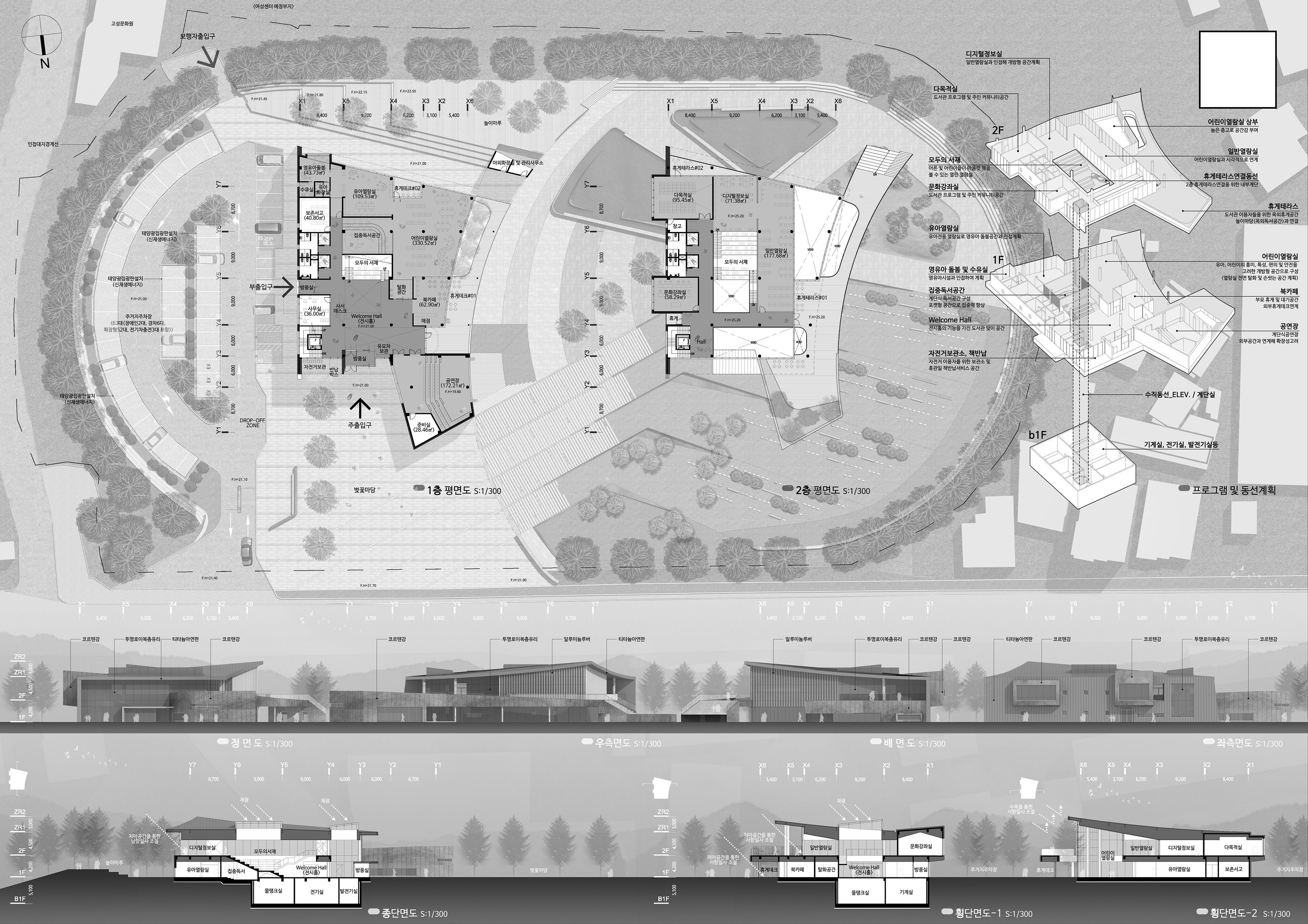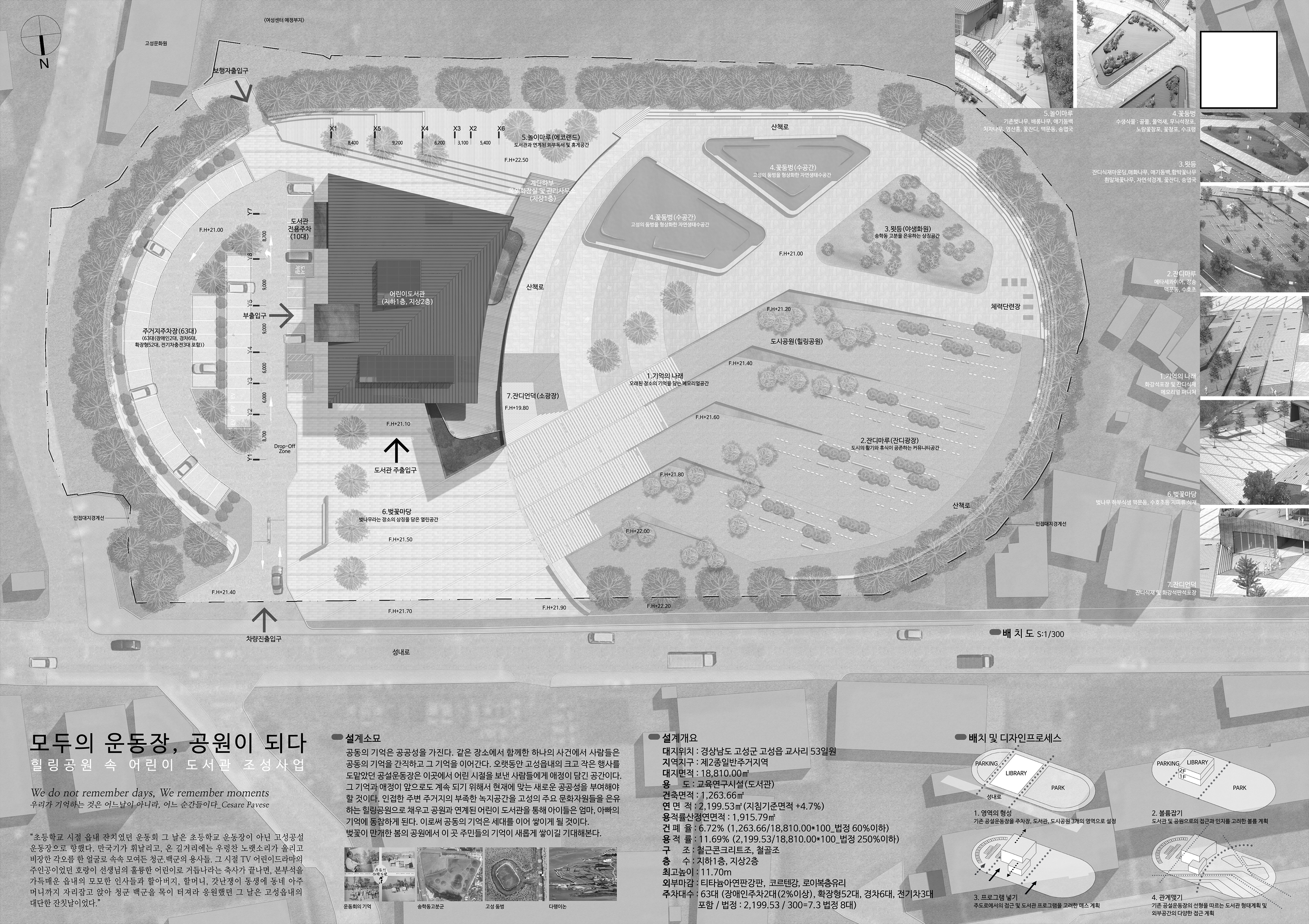 1st Prize_with 주.무위건축사사무소 대지위치 : 경상남도 고성군 고성읍 교사리 지역지구 : 제2종일반주거지역 대지면적 : 18,810.00㎡ 건축면적 : 1,263.66㎡ 연면적 : 2,199.53㎡ 건축규모 : 지하 1층, 지상2층 용도 : 교육연구시설(도서관)