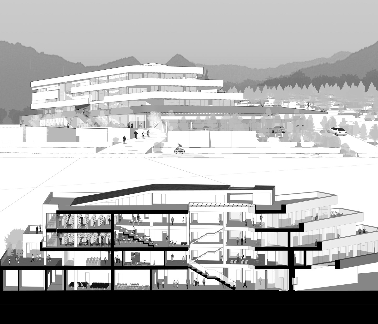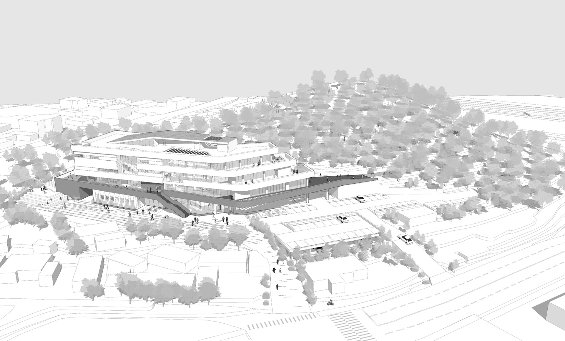 Competition Proposal_With 주.무위건축사사무소 + MPA 대지위치 : 경상남도 사천시 정동면 대지면적 : 7,019.00㎡ 지역지구 : 자연녹지지역, 근린공원 건축면적 : 1,398.72㎡ 연면적 : 4,733.56㎡ 건축규모 : 지하1층, 지상3층 용도 : 교육연구시설(도서관)
