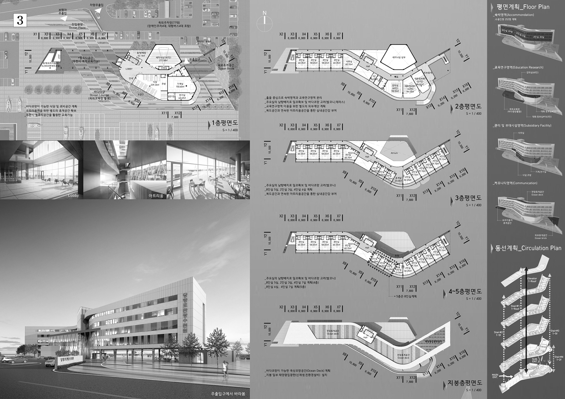3rd Prize_With 주.무위건축사사무소 대지위치 : 경상남도 고성군 회화면 지역지구 : 계획관리지역 대지면적 : 28,545.00㎡ 건축면적 : 1,896.73㎡ 연면적 : 4,926.09㎡ 건축규모 : 지상5층 용도 : 교육연구시설, 문화 및 집회시설