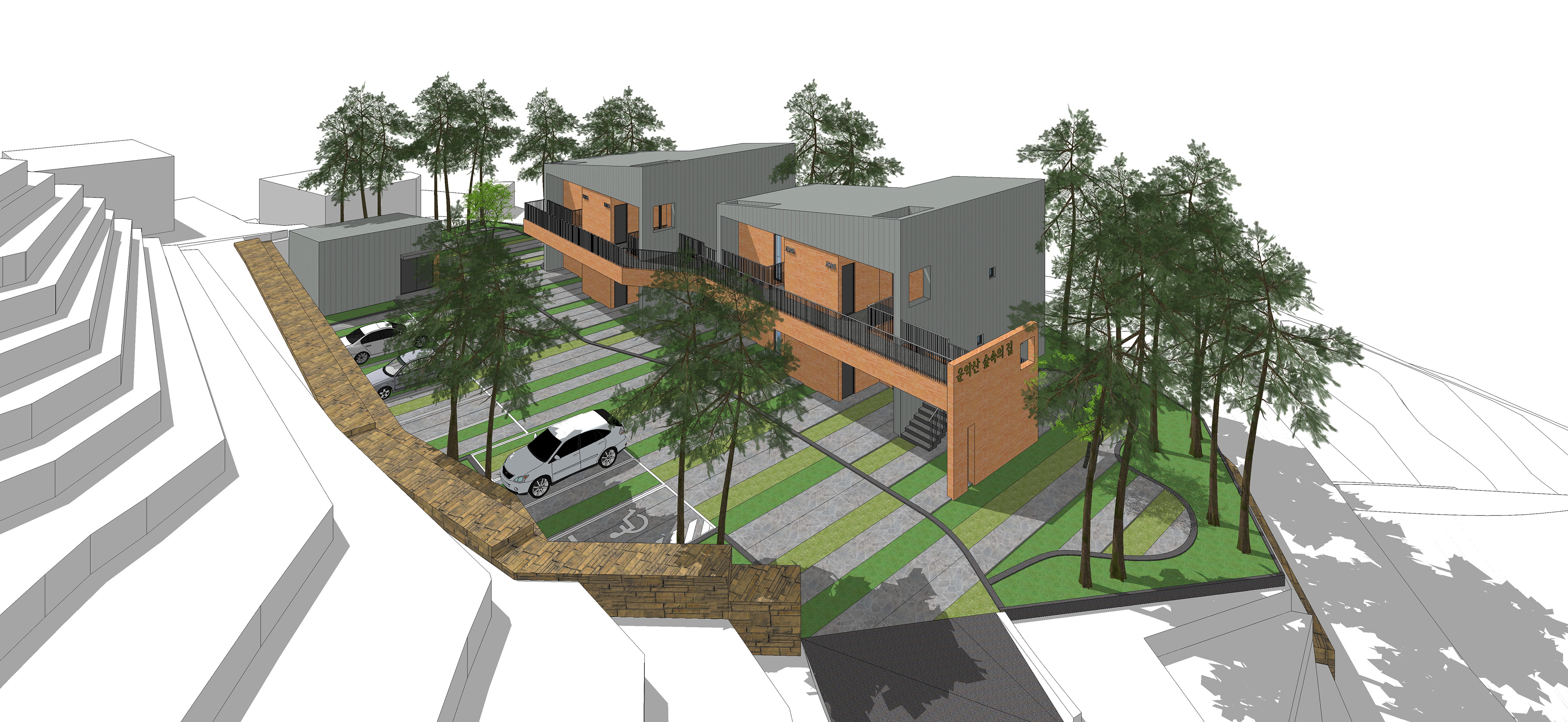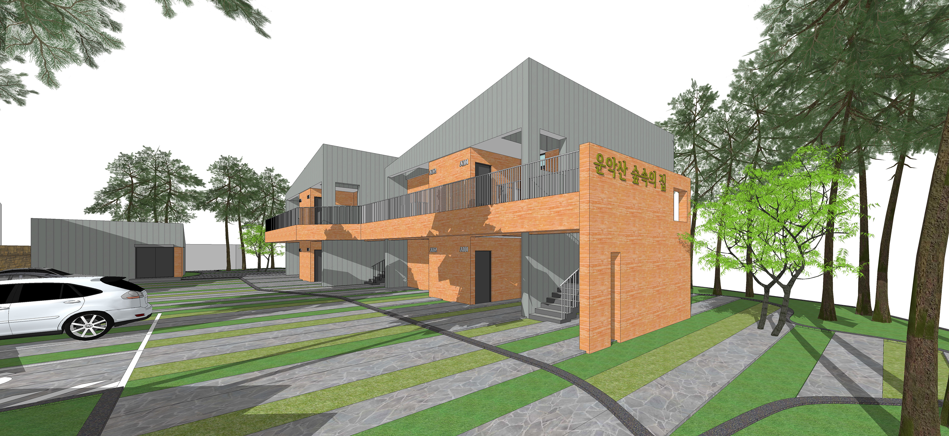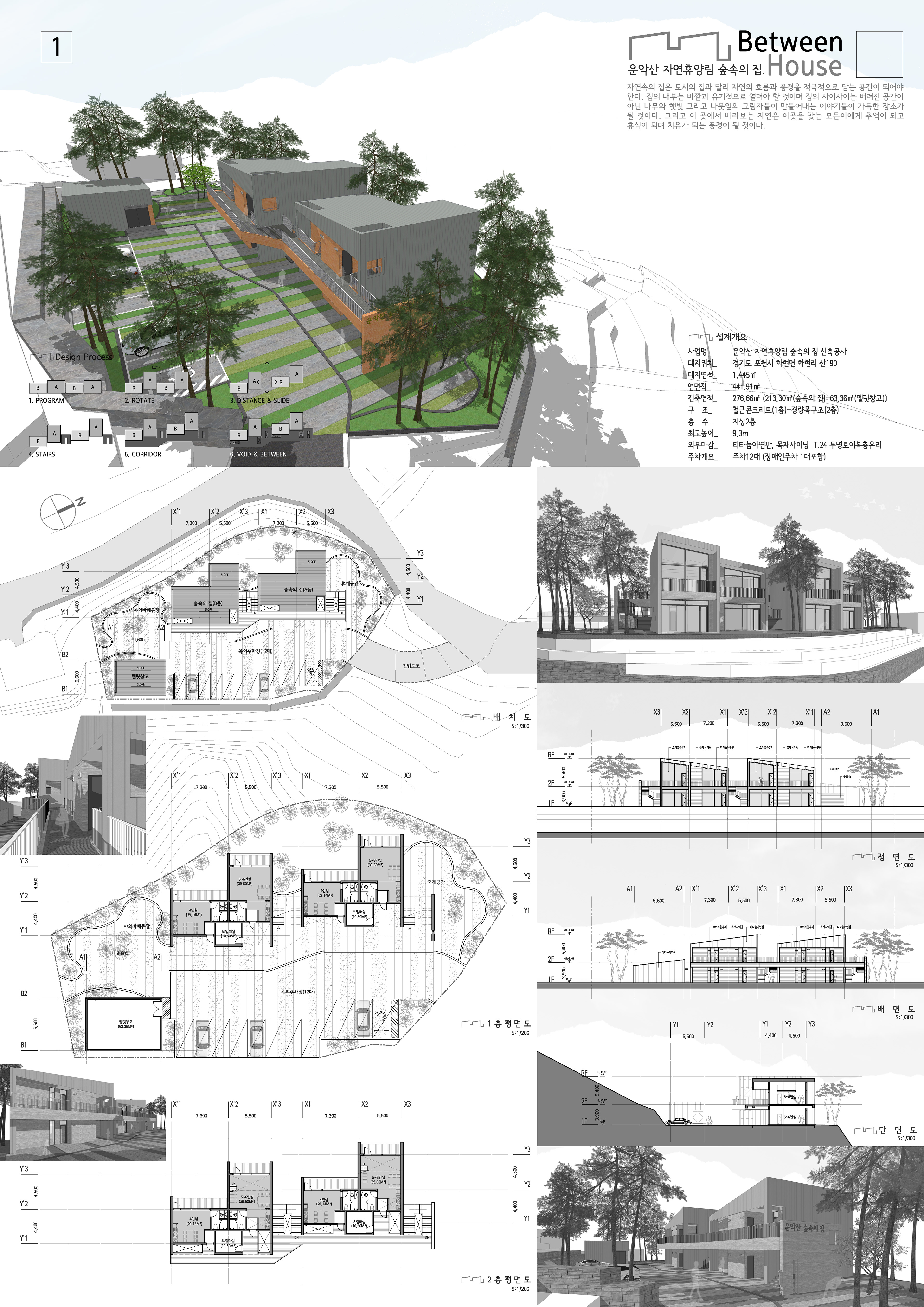Competition Proposal 대지위치 : 경기도 포천시 회현면 대지면적 : 1,445.00㎡ 건축면적 : 276.66㎡ 연면적 : 441.91㎡ 건축규모 : 지상2층 용도 : 숙박시설(숲속의 집)