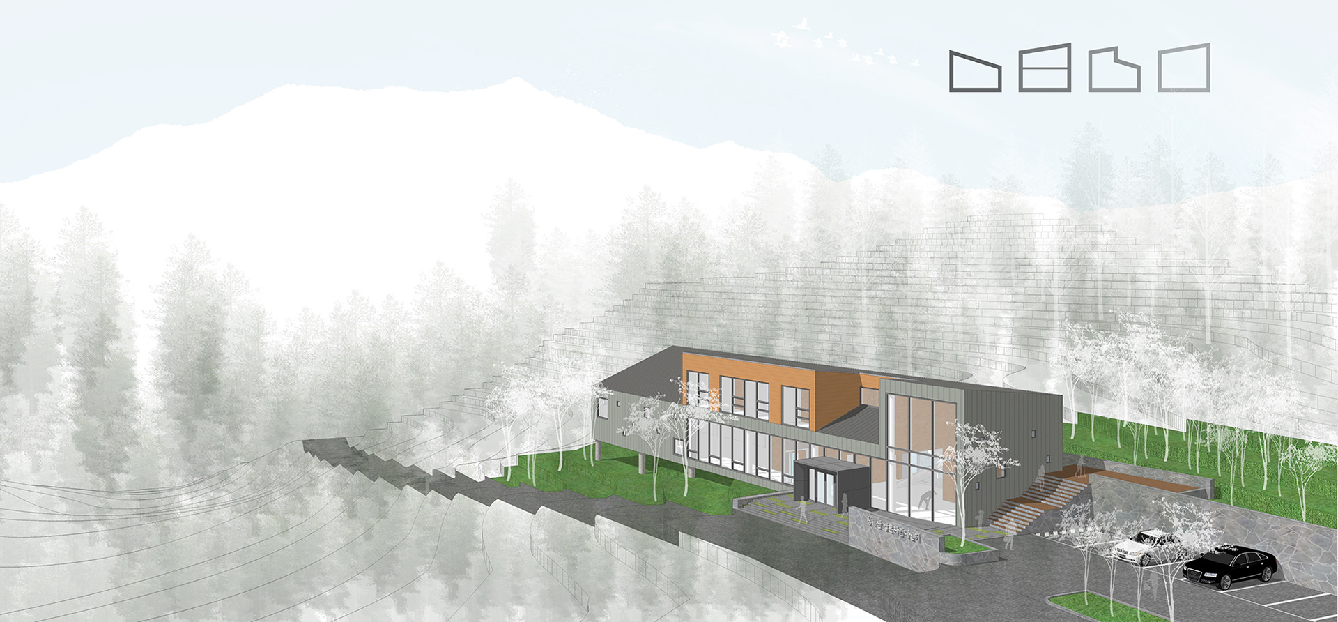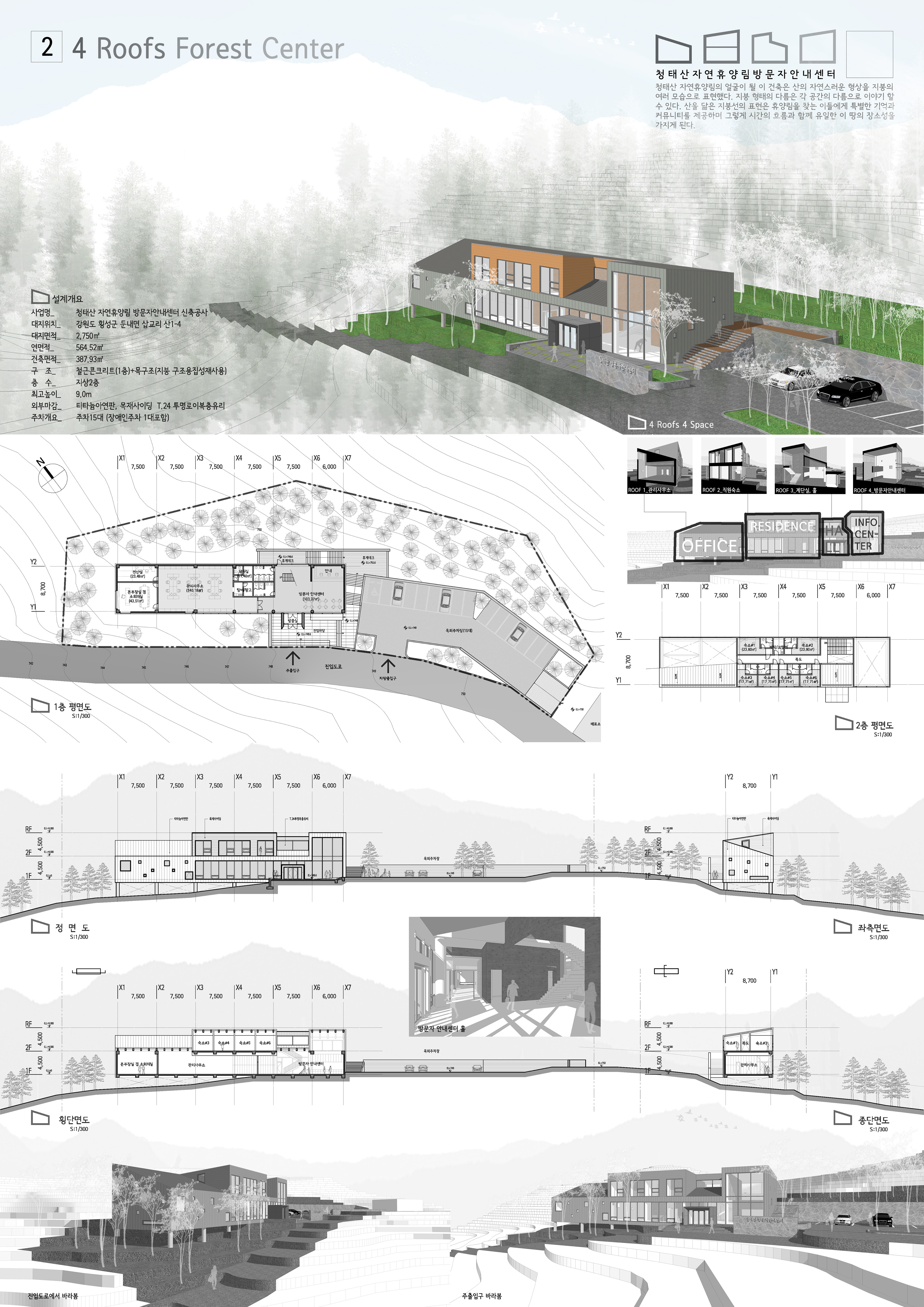 Competition Proposal 대지위치 : 강원도 횡성군 둔내면 대지면적 : 2,750.00㎡ 건축면적 : 387.93㎡ 연면적 : 564.52㎡ 건축규모 : 지상2층 용도 : 방문자안내센터