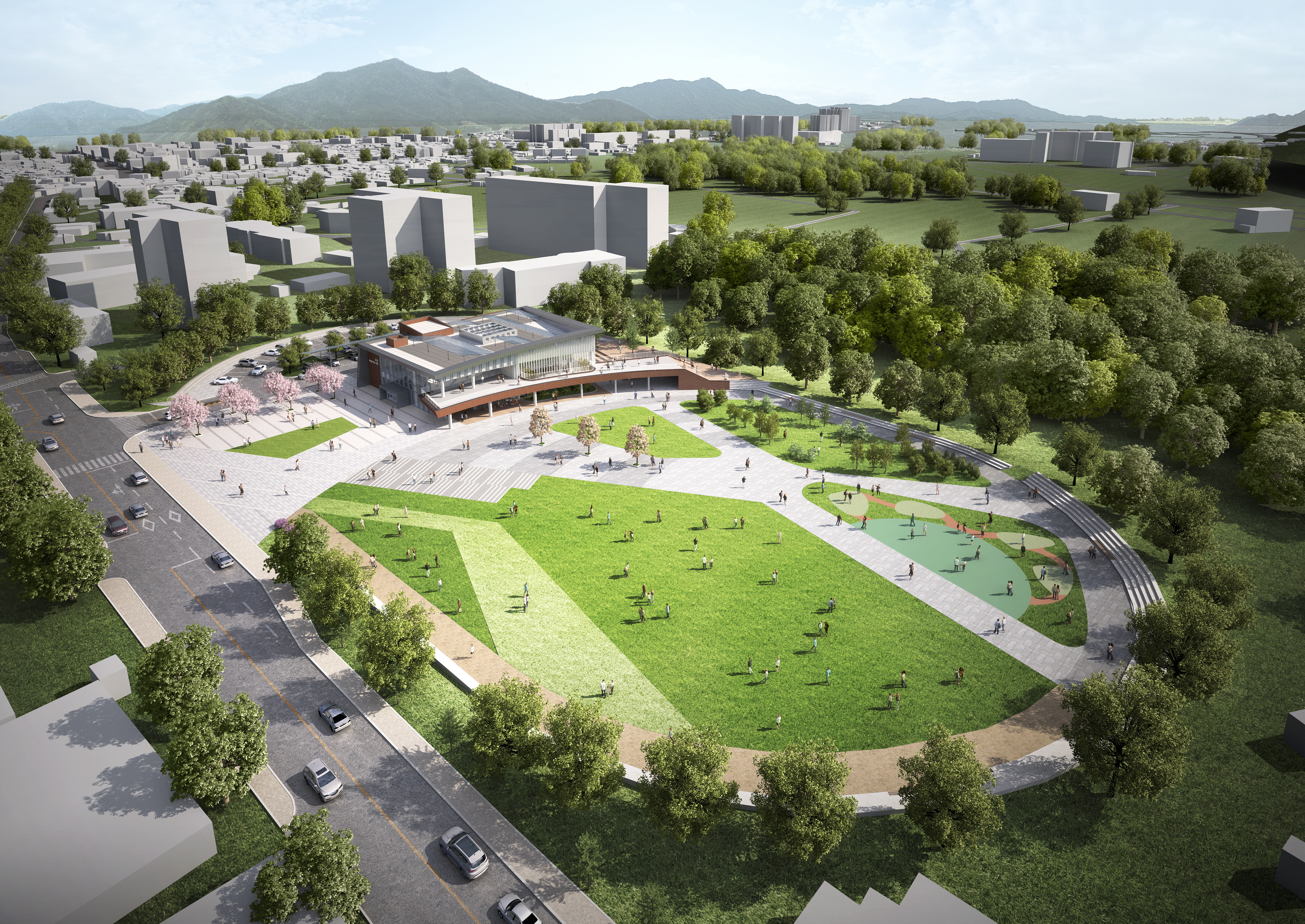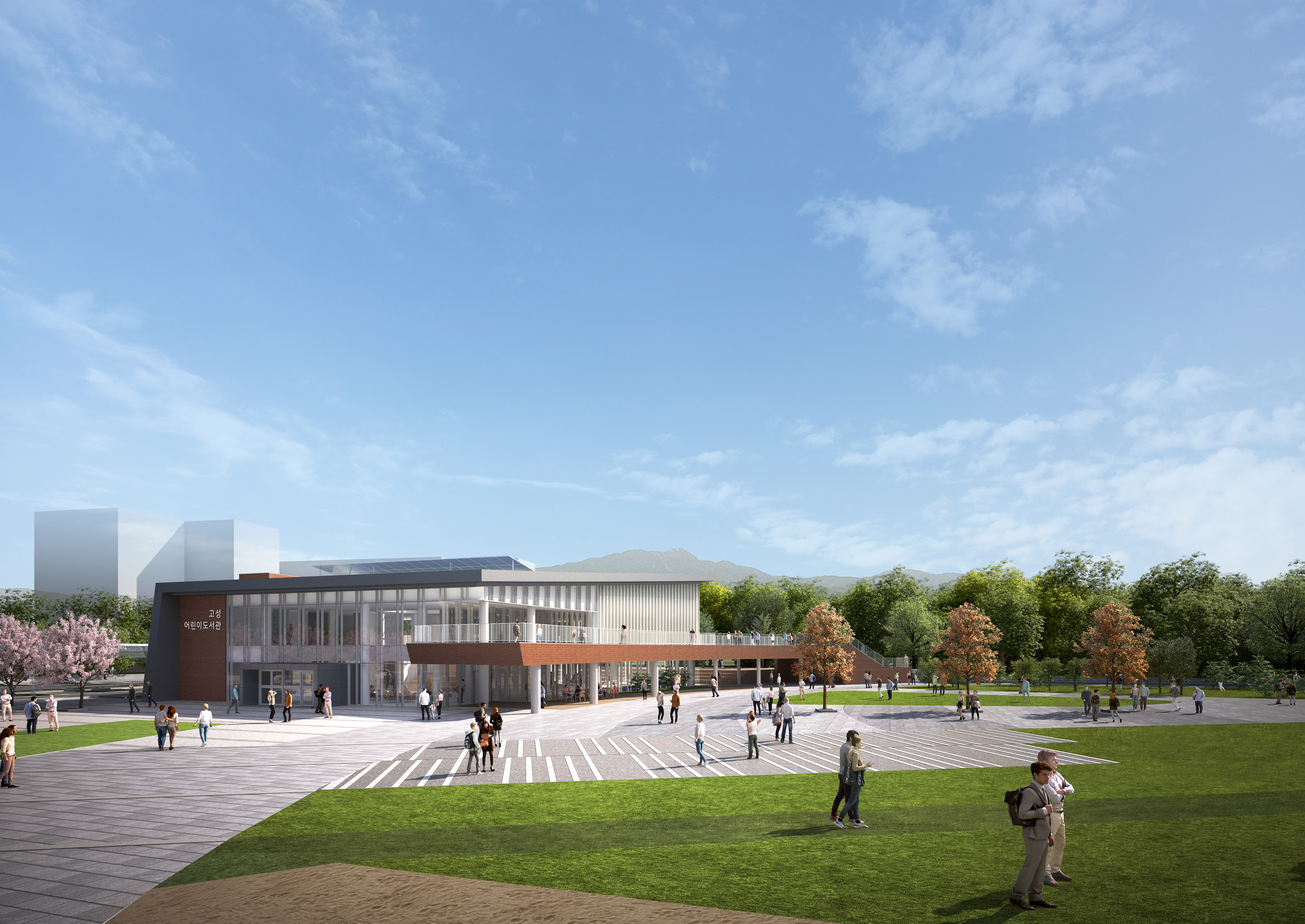 with 주.무위건축사사무소 대지위치 : 경상남도 고성군 고성읍 교사리 지역지구 : 제2종일반주거지역 대지면적 : 18,810.00㎡ 건축면적 : 1,443.39㎡ 연면적 : 2,131.75㎡ 건축규모 : 지하 1층, 지상2층 용도 : 교육연구시설(도서관)